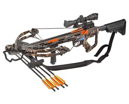 Комплектация Оптический прицел с подсветкой, сменный тыльник, рукоятка тактическая, кивер, натяжитель тетивы, ремень, стрела арбалетная карбон 4 шт, воск